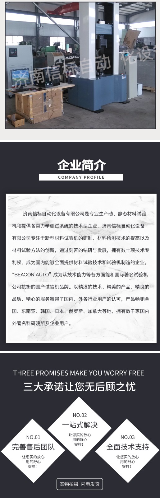 濟南信標自動化設備有限公司主要生產:動靜態萬能疲勞試驗機,接骨板彎曲試驗機,縫合線拉伸疲勞試驗機,髖膝關節磨損試驗機,電子萬能試驗機、液壓萬能試驗機、巖石三軸、四軸,電液拉力試驗機,材料試驗機,高低溫蠕變,高低頻疲勞,拉伸、扭轉、杯突等二十多個系列兩千多個的品種。