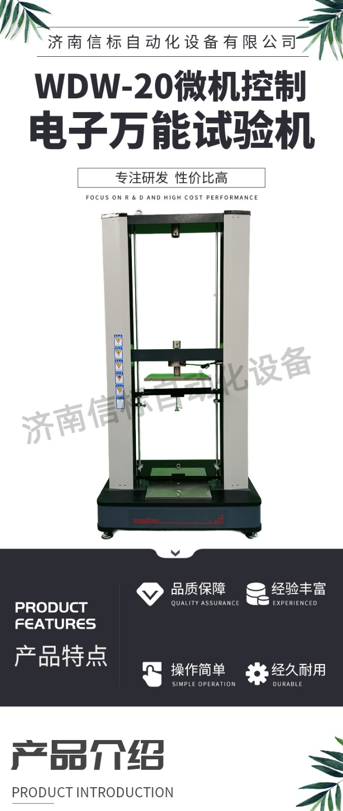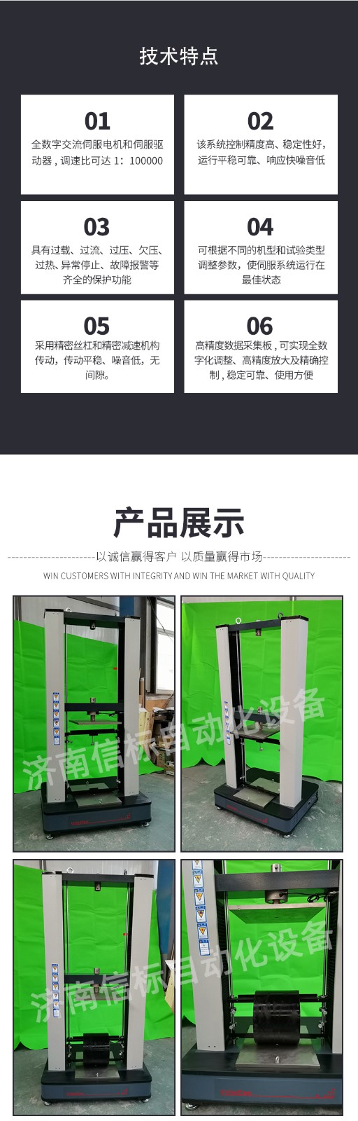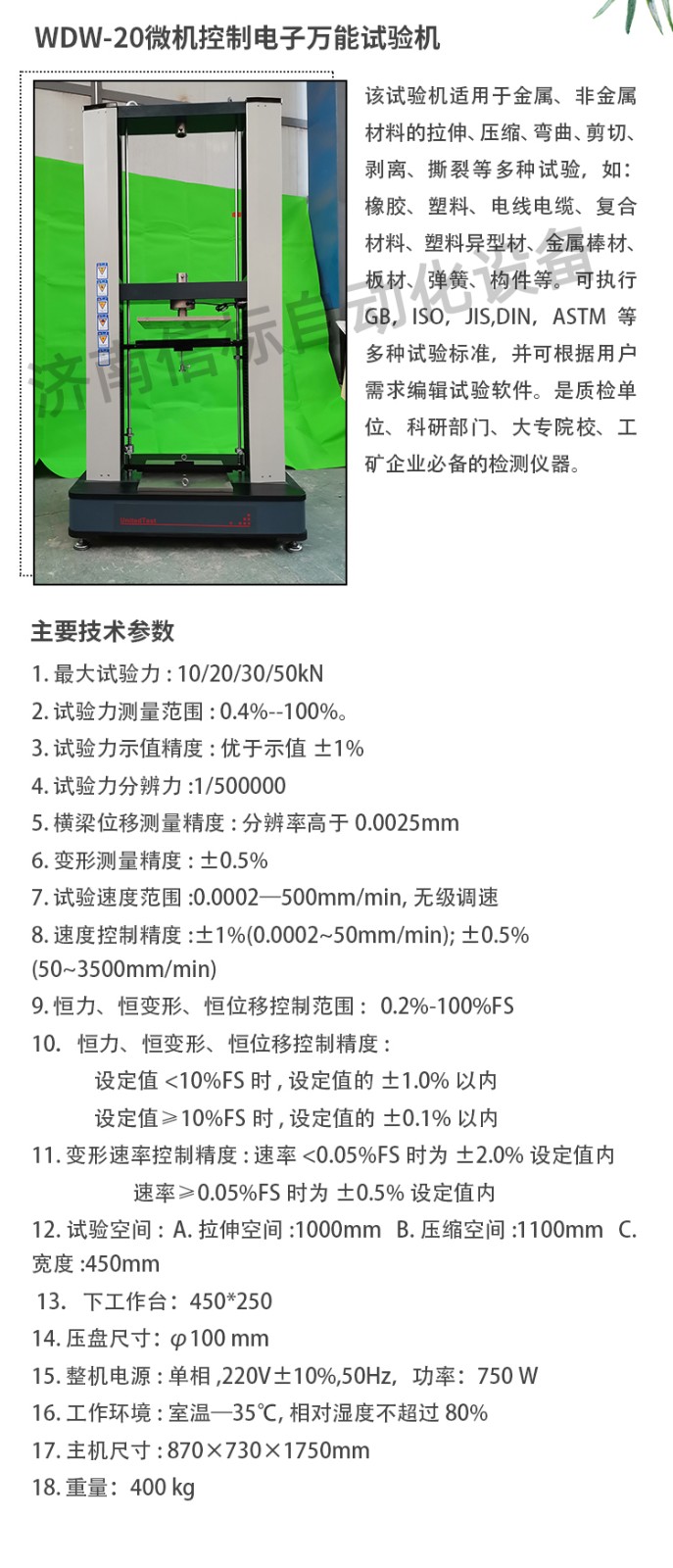 測量參數(shù): 1. 最大試驗(yàn)力: 10/20/30/50kN 2. 試驗(yàn)力測量范圍: 0.4%--100%。 3. 試驗(yàn)力示值精度:優(yōu)于示值±1% 4. 試驗(yàn)力分辨力:1/500000 5. 橫梁位移測量精度:分辨率高于0.0025mm 6. 變形測量精度: ±0.5% 7. 試驗(yàn)速度范圍:0.0002—500mm/min,無級調(diào)速 8. 速度控制精度:±1%(0.0002~50mm/min); ±0.5%(50~3500mm/min) 9. 恒力、恒變形、恒位移控制范圍: 0.2%-100%FS 10.恒力、恒變形、恒位移控制精度: 設(shè)定值<10%FS時(shí),設(shè)定值的±1.0%以內(nèi) 設(shè)定值≥10%FS時(shí),設(shè)定值的±0.1%以內(nèi) 11. 變形速率控制精度: 速率<0.05%FS時(shí)為±2.0%設(shè)定值內(nèi) 速率≥0.05%FS時(shí)為±0.5%設(shè)定值內(nèi) 12. 試驗(yàn)空間: A.拉伸空間:1000mm B.壓縮空間:1100mm C.寬度:450mm 13.下工作臺:450*250 14. 壓盤尺寸:φ100 mm 15. 整機(jī)電源:單相,220V±10%,50Hz,功率:750 W 16. 工作環(huán)境:室溫—35℃,相對濕度不超過80% 17. 主機(jī)尺寸: 870×730×1750mm 18. 重量:400 kg 產(chǎn)品配置: 1、主機(jī) 一套 2、松下A7全數(shù)字伺服電機(jī)及伺服驅(qū)動(dòng)器; 一套 3、高精度負(fù)荷傳感器; 5kn/1kn/500N/200/ 各一支 4、Hiwin精密滾珠絲杠; 2支 5、光電編碼器(2500線,內(nèi)置); 1支 6、夾具:滿足海綿/汽車座椅所需工裝 1套(有多種) 7、三閉環(huán)測量系統(tǒng)一套,采用力,位移,應(yīng)變等多種控制方式,試驗(yàn)過程中可實(shí)時(shí)顯示力-位移,力-時(shí)間,應(yīng)力-應(yīng)變等多種試驗(yàn)曲線,并可自動(dòng)得出最大負(fù)荷,拉伸強(qiáng)度,斷裂伸長率等多種 結(jié)果參數(shù)。 8、HP品牌計(jì)算機(jī),21寸液晶顯示器; 9、打印機(jī):HPA4彩色噴墨打印機(jī); 10、專用試驗(yàn)軟件:可執(zhí)行GB,ISO,JIS、DIN,ASTM等多種試驗(yàn)標(biāo)準(zhǔn),全開放式,功能強(qiáng)大,方便操作,免費(fèi)提供升級軟件,并可根據(jù)用戶需求自行編輯試驗(yàn)軟件。