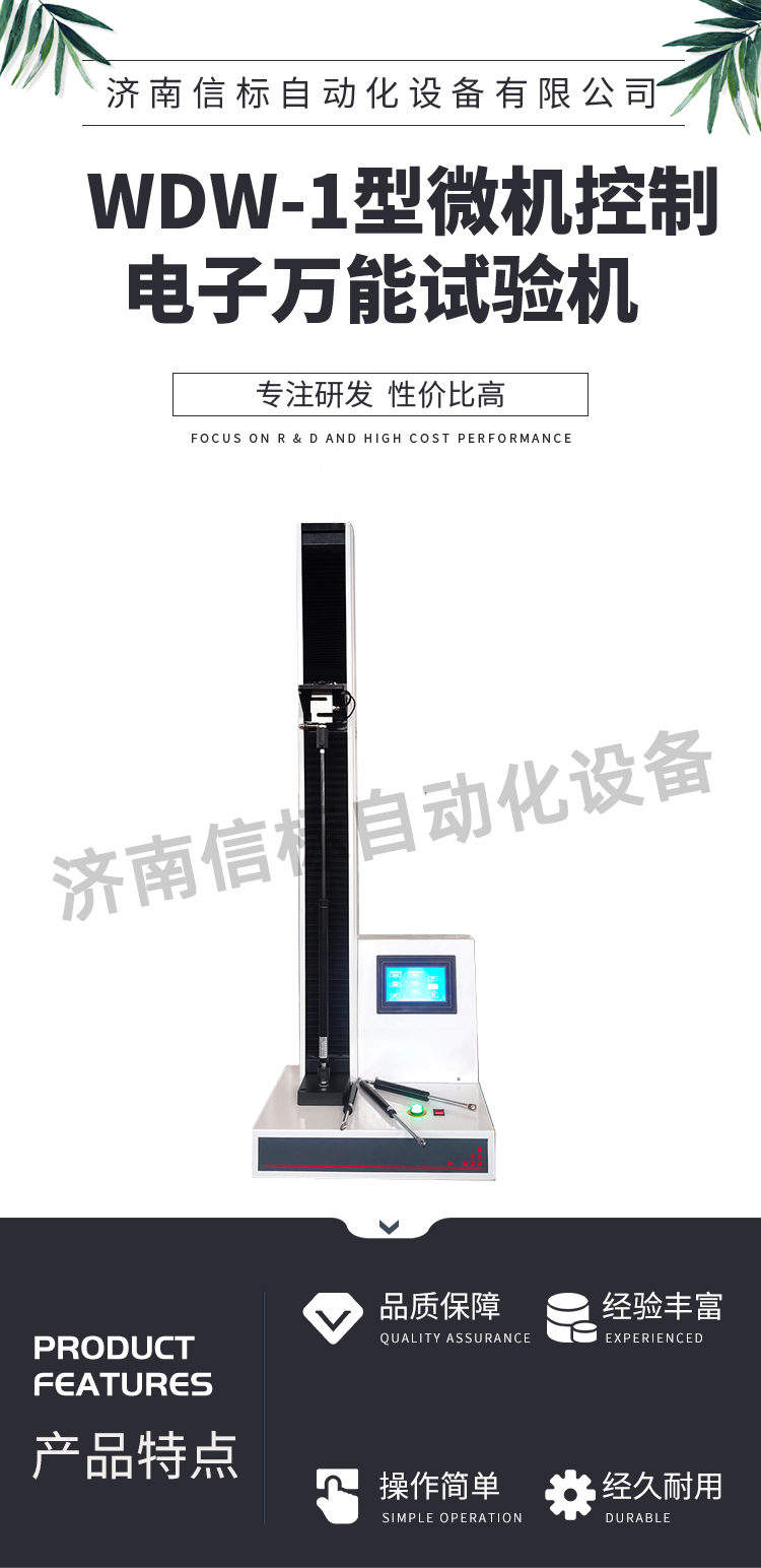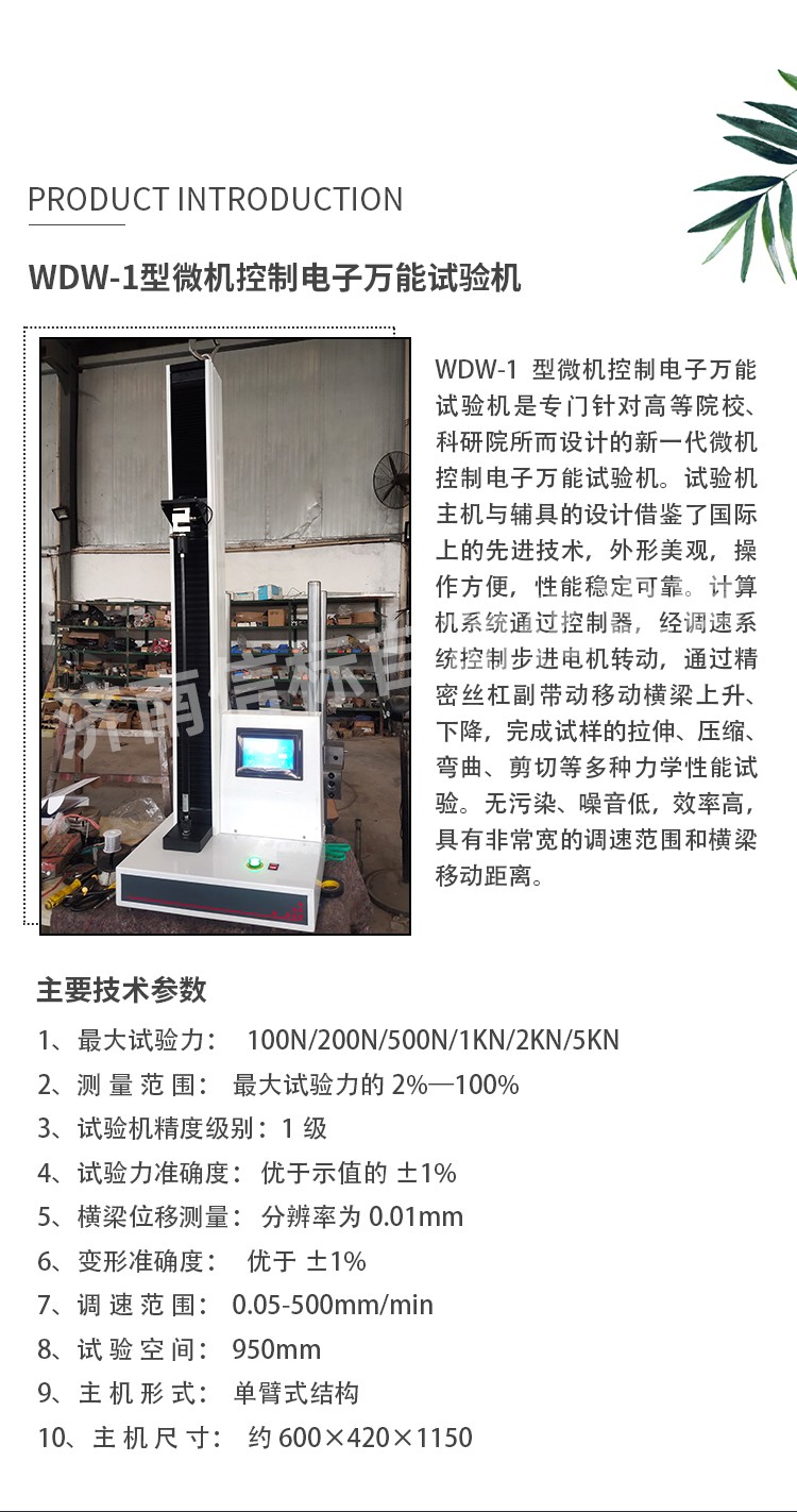 二、主要技術指標: 1、最大試驗力: 100N/200N/500N/1KN/2KN/5KN 2、測 量 范 圍: 最大試驗力的2%—100% 3、試驗機精度級別:1級 4、試驗力準確度: 優于示值的±1% 5、橫梁位移測量: 分辨率為0.01mm 6、變形準確度: 優于±1% 7、調 速 范 圍: 0.05-500mm/min 8、試 驗 空 間: 950mm 9、主 機 形 式: 單臂式結構 10、主 機 尺 寸: 約600×420×1150 11、重 量: 約90Kg 12、工 作 環 境: 室溫~45℃,濕度20%~80%