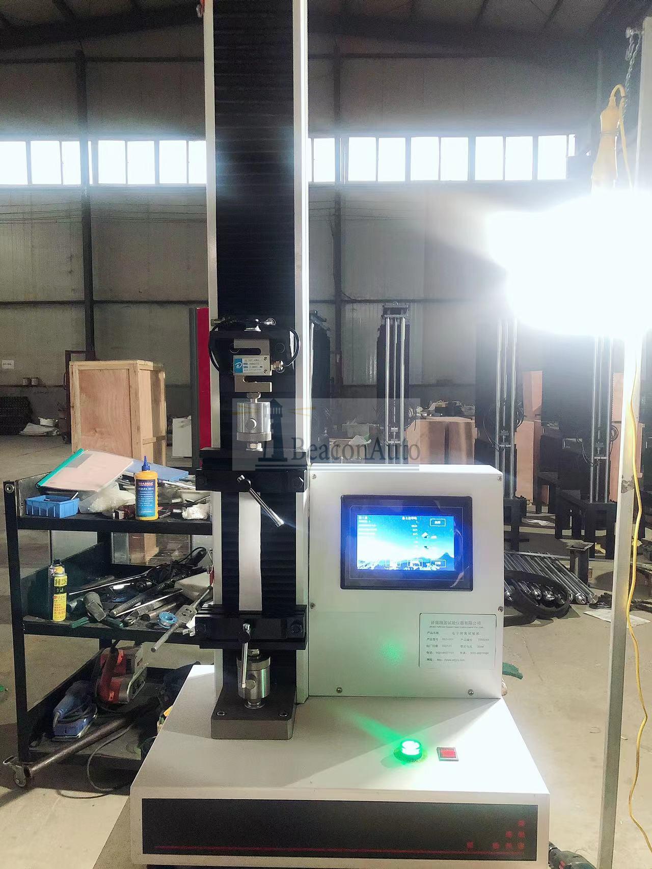 口罩隔離防護服抗拉強度試驗機 口罩隔離防護服抗拉強度試驗機產品型號:WDL-05 口罩隔離防護服抗拉強度試驗機產品用途:該機廣泛應用于醫用口罩,防護隔離服,口罩包裝袋,橡膠、塑料、紡織物、防水材料、無紡布等非金屬材料及金屬絲、金屬箔、金屬片的壓拉伸撕裂性能試驗。 口罩隔離防護服抗拉強度試驗機產品特點:1、采用高精度、全數字調速系統及精密減速機, 驅動精密絲杠副進行試驗,實現試驗速度的大范圍調節, 試驗過程噪音低、運行平穩。 2、萬向節采用十字插銷結構,而且具有擺角限制功能, 一方面便于試樣夾持,保證試驗同心度, 另一方面很好的消除了不規則試樣對傳感器的影響。 3、觸摸鍵操作方式,液晶顯示器實時顯示。 顯示界面可顯示試驗方法選擇界面、試驗參數選擇界面、試驗操作及結果顯示界面和曲線顯示界面,方便快捷。 4、可實現試樣裝夾時橫梁快慢升降調整,具有過流、過壓、過載等保護裝置。 5、選配微機接口,可外接微機實現試驗過程的控制及數據的存儲、打印。 口罩隔離防護服抗拉強度試驗機技術參數: 主要技術指標 | 型號 | WDL系列液晶屏顯電子拉力試驗機 | 規格 | WDL系列 | 試驗力 | 200N | 300N | 500N | 1000N | 2000N | 結構形式 | 單臂式 | 壓縮空間 | 600mm | 負荷測量范圍 | 最大負荷的2%-100% | 負荷測量精度 | 優于示值的±1% | 橫梁位移速度 | 0-500mm/min無級調速 | 速度精度 | ±1% | 外形尺寸(mm) | 530*266*1450 | 夾具配置 | 拉伸夾具一套(根據用戶試樣要求) | 電源 | 單相交流220V±10%V | 重量(kg) | 60kg |